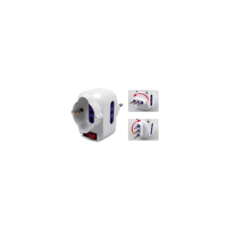 Adattatore triplo con spina rotante 16A e 2 prese 10/16A+1 schuko 10/16A.Protezione bambini, interruttore luminoso e potenza massima supportata 1500W