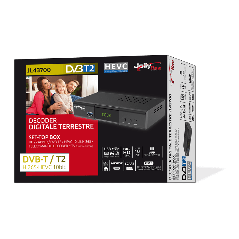 DECODER DIGITALE TERRESTRE T2 HEVC 265 10BIT JOLLYLINE JL43700 Decoder Digitale Terrestre DVB-T2 Full HD 1080p zapper HEVC Main 10 con Telecomando Universale ad apprendimento per Decoder e TV. Compatibilità DVB-T/T2 in standard HEVC main 10bit H.265 e H.264. Telecomando IR universale con autoapprendimento per pilotare DECODER e TV. Uscita audio digitale coassiale. Risoluzione video: 576i/p; 720p; 1080i, Full HD 1080p. Display a 4 digit con orario (quando in stand-by) e canale in corso di visione. Guida Elettronica ai programmi TV (EPG) in corso di visione. Funzione LCN per numerazione automatica canali in base all’importanza dello standard nazionale. Menù multi-lingua. Ricerca canali automatica e manuale. 1.000 canali (TV/Radio). Accensione sull'ultimo canale selezionato. Supporta l’attivazione Controllo Genitori. Porta USB 2.0 (Media Player per Musica/Foto/Video/ aggiornamento SW. Supporta formati audio MP3; immagini JPG, PNG, JPEG, video AVI, MOV, MP4, MKV, VOB, FLV). Porta LAN RJ-45 per accesso Internet con APP precaricate (Meteo; IPTV; flussi RSS). Chassis metallico. Dimensioni 168 x 86 x 35mm. CONNESSIONI E ALIMENTAZIONI -Ingresso Antenna: IEC attacco femmina-Uscita Antenna: Loop Through IEC attacco maschio -Uscite: HDMI (fino a 1080P); SCART; Audio Digitale Coax. -Porte: USB 2.0 / Rete LAN RJ-45 -Alimentazione 100-240V~, 50/60Hz -Batterie per telecomando incluse (2x AAA 1,5V) Definizione Full HD 1080p HEVC MAIN 10 Codifica H.265 10BIT; H.264 Canali 1000 Materiale Metal Dimensioni 168x86x35 mm Peso 1 kg Alimentazione 100-240V~, 50/60Hz Confezione Scatola Colore Nero