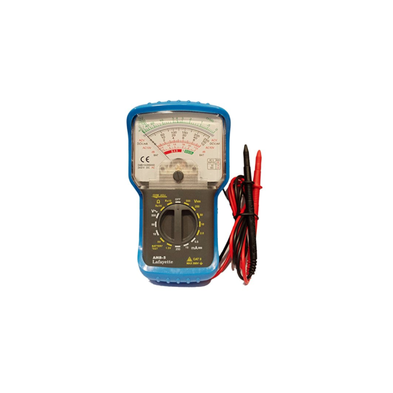 0 Articolo - 0,00 €6 Funzioni/16 Portate Conforme alle normative: EN61010/IEC1010 Categoria II300V Misura di tensioni DC: 0~2.5/10/50/250/500V (2 kOhm/V) ±0.5%f.s. Misura di tensioni AC: 0~10/50/250/500V (2 kOhm/V) ±0.5%f.s. Misura di correnti DC: 0~0.5m/10m/250mA±5%f.s. Misura di resistenze: 0~2k/2 MOhm ±5% full arc Prova batterie: 1.5V (125mA)/9V (10mA) Decibel: -10 ~ 56 dB Dimensioni: 150 x 90 x 50 mm compresa la custodia Peso: 250g compresa la custodia6 Funzioni/16 Portate Conforme alle normative: EN61010/IEC1010 Categoria II300V Misura di tensioni DC: 0~2.5/10/50/250/500V (2 kOhm/V) ±0.5%f.s. Misura di tensioni AC: 0~10/50/250/500V (2 kOhm/V) ±0.5%f.s. Misura di correnti DC: 0~0.5m/10m/250mA±5%f.s. Misura di resistenze: 0~2k/2 MOhm ±5% full arc Prova batterie: 1.5V (125mA)/9V (10mA) Decibel: -10 ~ 56 dB Dimensioni: 150 x 90 x 50 mm compresa la custodia Peso: 250g compresa la custodia