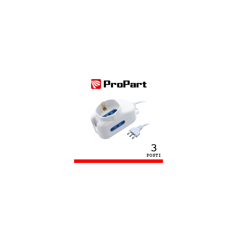 Multipresa 3 posti: 2 prese 10/16A bipasso 2P+T+1 presa 10/16A bipasso/schuko 2P+T con asola nel corpo plastico per fissaggio.250V-Max:3500WCavo H05VV-F 3.G1.0mm2X1.3 mt