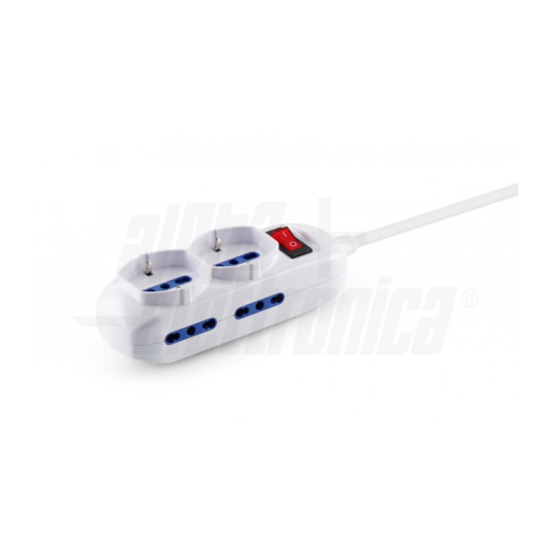 Carico massimo 2500W2 prese Universali e 4 bipasso 10-16ACon interruttore luminosoCavo 3 mtSpina 16A a 90°