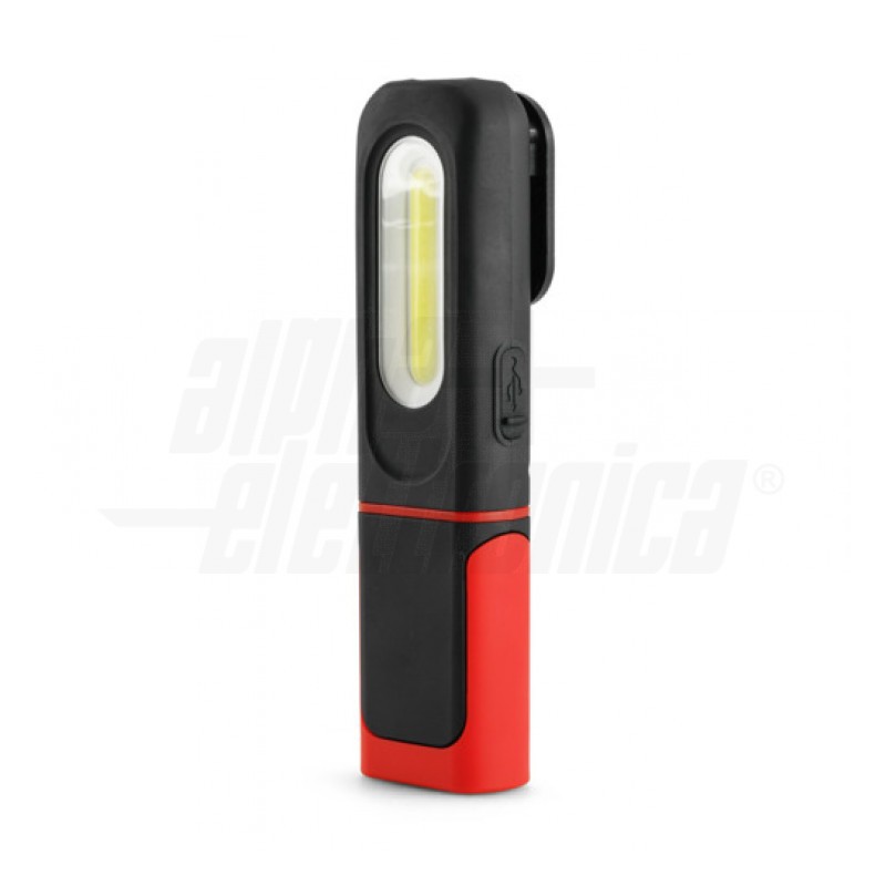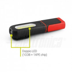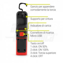 A batteria orientabile, selettore sul retro per scegliere la modalità di funzionamento.Potente magnete per fissare la torcia.